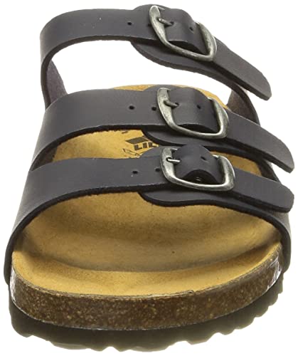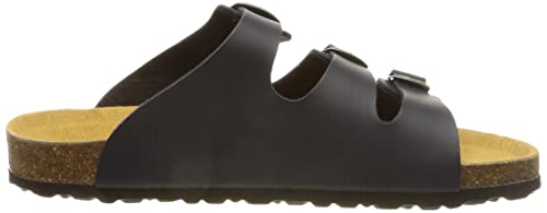 Slippers voor volwassenen met verstelbare gesp. Bovenmateriaal: synthetisch leren dekzool. Voetbed: kurk/rubber dempende EVA-zool