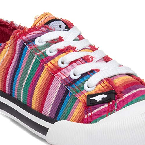Ogen hier beneden, alsjeblieft. Deze kleurrijke gestreepte sneaker steelt de show en is een zekere manier om je dag en garderobe op te fleuren. De klassieke sneakerstijl van een witte rubberen neus is een gigantische inkeping omhoog geschopt met een regenboog gestreept katoenen bovenwerk.